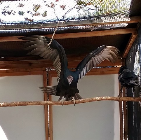 At the Center, no injuries were found but there was a slight weakness in one wing. The dark-faced vulture spent two days in a recovery cage; there were no vacant flights available and he was moved in with two Ravens. No one was particularly happy with the arrangements.