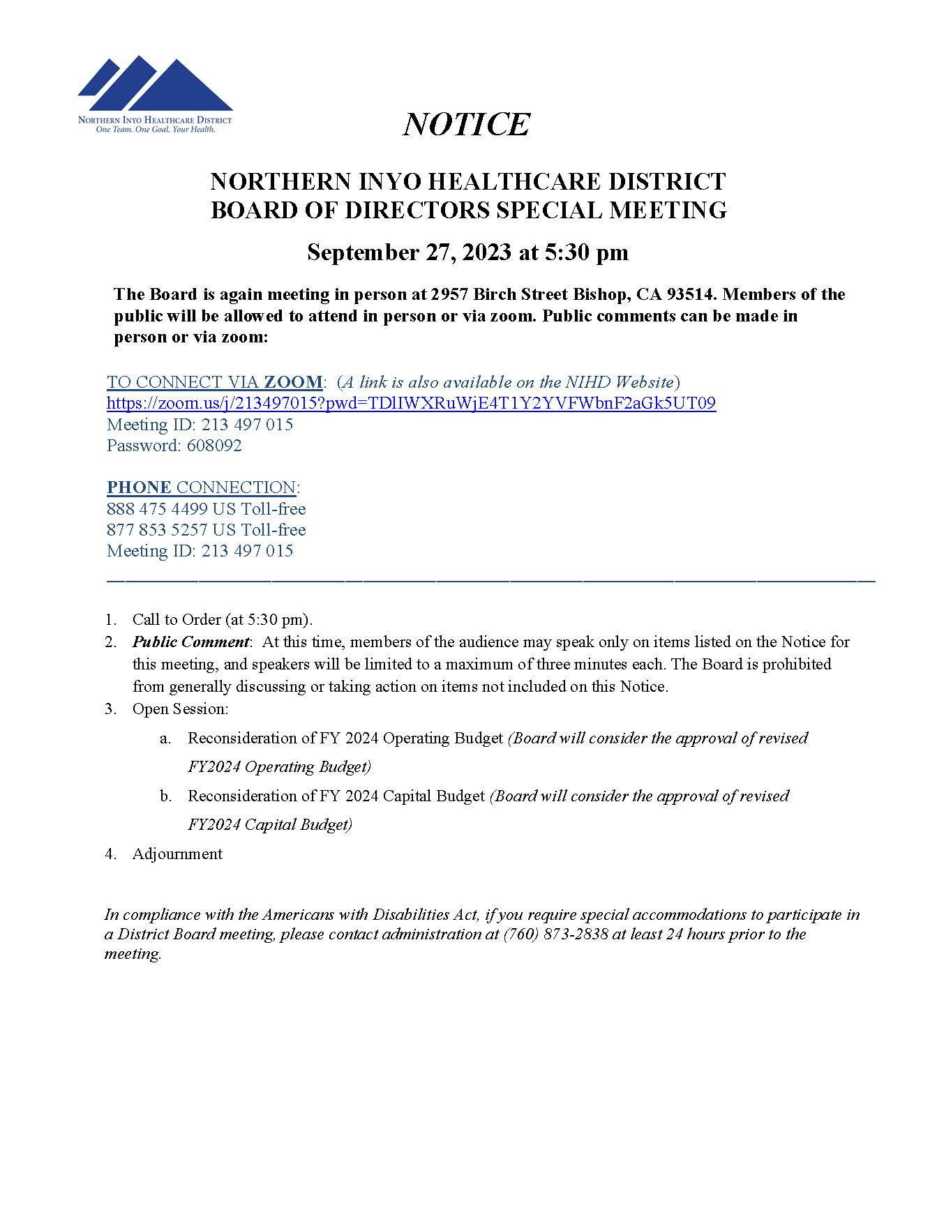 Northern Inyo Healthcare District Board of Directors to Hold Special Meeting September 27, 2023 by Community Reports/Events | Sep 26, 2023 | Healthcare /Hospitals, News Releases, Northern Inyo Healthcare District, Public Service Announcement | 0 comments Share this: Click to share on Facebook (Opens in new window) Facebook Click to share on X (Opens in new window) X Related Discover more from Sierra Wave: Eastern Sierra News - The Community's News Subscribe to get the latest posts sent to your email. Type your email… Subscribe Submit a Comment Cancel replyYou must be logged in to post a comment. This site uses Akismet to reduce spam. Learn how your comment data is processed.