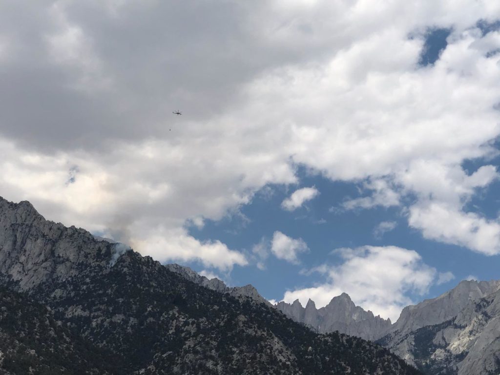The Inyo Creek Fire continued to burn overnight and through today. Caused by lightning, the fire is approximately 50 acres and burning on the Northeast side of Lone Pine Peak and very close to the Meysan Lake Drainage that runs directly toward Whitney Portal. There is 0% containment because ground crews are limited on taking direct action on the fire due to the steep and rugged terrain the fire is burning in. Helicopters have been providing bucket drops to try to keep the fire in check, however mechanical problems have limited the number of helicopters that are able to work on that task.